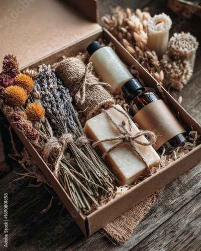 Obraz premium Natural Skincare Gift Set with Handmade Soap, Essential Oils, and Dried Flowers in Eco-Friendly Packaging