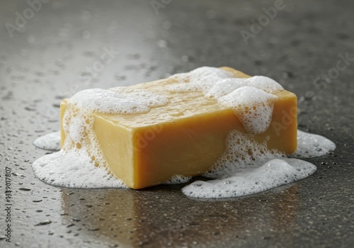 Naklejka premium Natural Soap Bar with Foam on Wet Surface