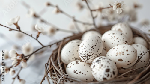 Fototapeta premium Natural speckled eggs in twig nest surrounded by soft white blossoms, heralding spring.