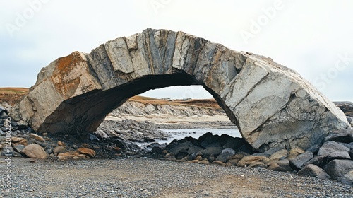 © AbstractAI, Fototapeta premium Natural stone arch formation at coastal landscape with rugged textures and serene atmosphere under cloudy sky
