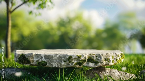 Obraz premium Natural stone platform on green grass meadow with wildflowers and blurred...