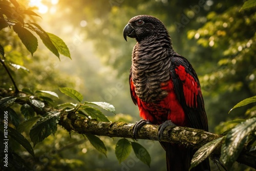 © The 2R Artificiality, Obraz premium Natural summer day with Pesquet parrot perched on green leafy branch