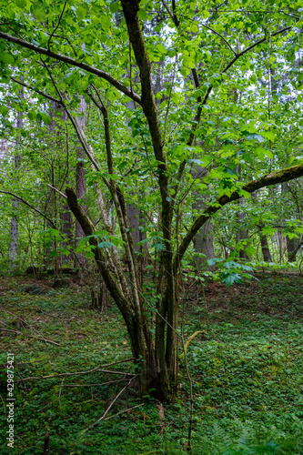 © Martins Vanags, Fototapeta premium natural summer forest lush with bushes, tree trunks and moss