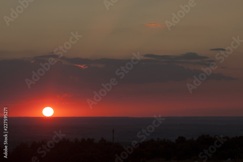 © pintxoman, Fototapeta premium Natural sun exposure on field or meadow. Bright dramatic sky and dark earth. Countryside landscape under scenic colorful sky at sunset. Sun over the horizon. Warm colors
