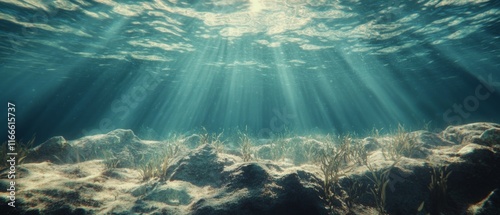 Obraz premium Natural sunlight underwater through water surface with seagrass and rock on the seabed