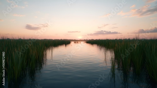 Fototapeta premium Natural sunset reflection over tranquil waterway marshland location scenic...