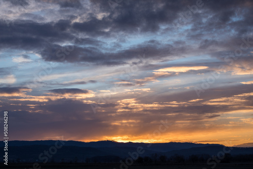© daliu, Fototapeta premium Natural Sunset Sunrise Over Field Or Meadow. Bright Dramatic Sky And Dark Ground. Countryside Landscape Under Scenic Colorful Sky At Sunset Dawn Sunrise. Sun Over Skyline, Horizon. Warm Colours.