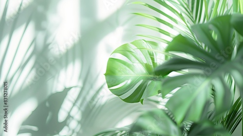 © Artsiom, Obraz premium Natural texture with leaves. Beauty and health concept. Stylish gradient with copy space. White Ribbed Background. Green palm with reeded glass.