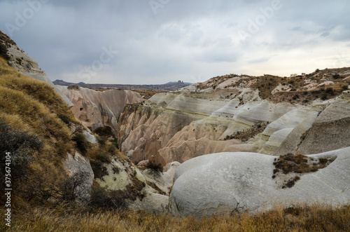 Naklejka premium Natural valley with volcanic tuff stone rocks in Goreme in Cappadocia, Central Anatolia region of Turkey. Popular tourist destination in Turkey for trekking.