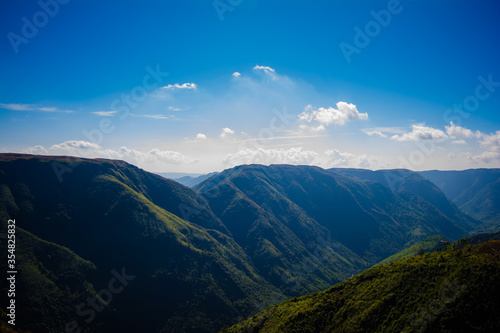 © View_From_My_Lens, Fototapeta premium Natural view of the folded mountains and lush green valleys with clear sky and clouds of Cherrapunji, Meghalaya, North East India