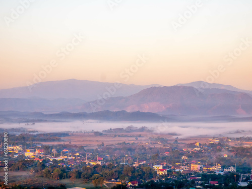 Obraz premium Natural viewpoint, mountains, hills, forests and river under morning mist in Chiangrai, Thailand