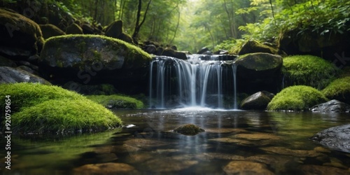 © Den Boro Day, Naklejka premium Natural waterfall with rocks and green moss waterfall Natural wallpaper.
