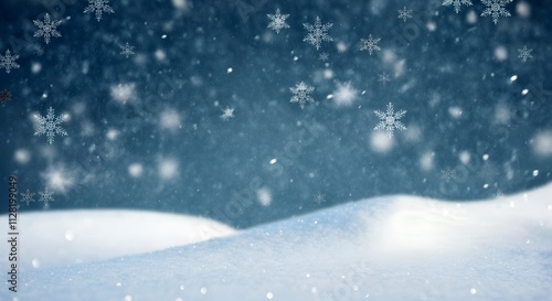 © Josh Zachary, Naklejka premium Natural Winter Christmas background with sky, heavy snowfall, snowflakes in different shapes and forms, snowdrifts. Winter landscape with falling christmas shining beautiful snow