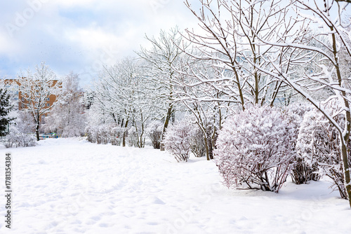 Naklejka premium Natural winter landscape. City park and road in snow. snow-covered tall trees...