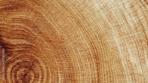 © yrabota, Naklejka premium Natural wooden background, close up wood annual rings form. Top view of cross section of juniper tree, graphic nature organic pattern. Sawed timber with tree ring print, natural textures banner