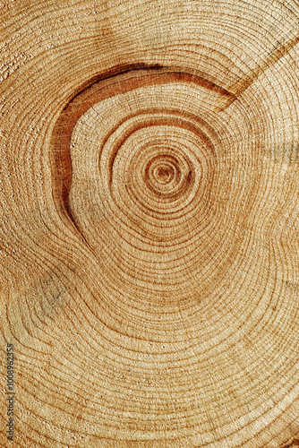 © yrabota, Naklejka premium Natural wooden background, wood texture annual rings form. Macro photo of cross section of juniper log, graphic nature organic pattern. Sawed timber close up with tree ring pattern, vertical