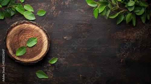 © backup_studio, Naklejka premium Natural wooden surface with green leaves and a tree stump, perfect for rustic decor and nature-inspired designs in an artistic setting