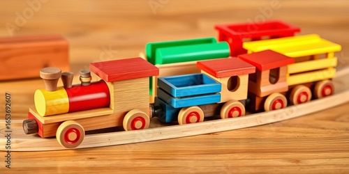 Fototapeta premium Natural wooden train set with colorful wagons, ready for imaginative play,...