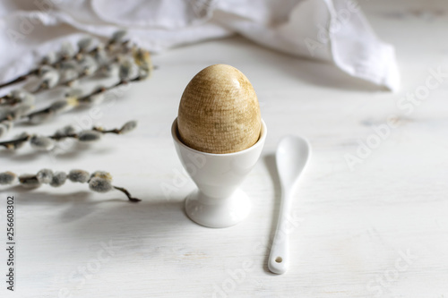 Fototapeta premium Naturally dyed easter egg for breakfast, white egg cup, draped napkin, white wooden table, willow banch - minimal easter concept