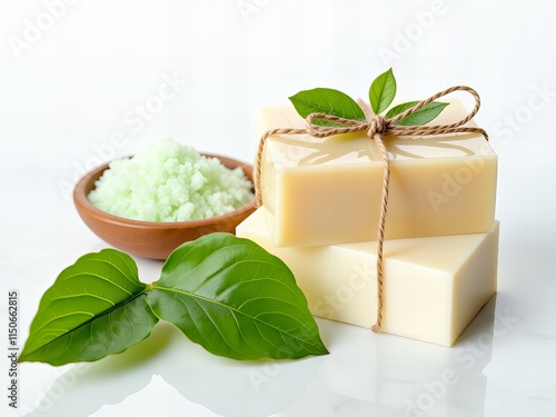 Obraz premium Naturalne mydła w kostce z zielonymi liśćmi i solami kąpielowymi na białym tle