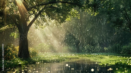Fototapeta premium Nature adorned with sunlight trees grass and rain