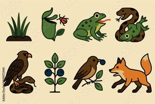 © Svitlana, Fototapeta premium Nature and wildlife outline icons set – linear, silhouette, forest animals and plants