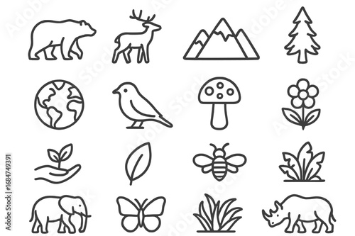 Fototapeta premium Nature and wildlife symbols displayed in a simple line art style for...
