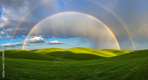Naklejka premium Nature Background Background beautiful rainbow landscape scenic nature green fields double rainbow sky clouds summer day