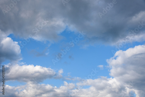 Naklejka premium Nature background, blue sky framed by white and gray puffy clouds