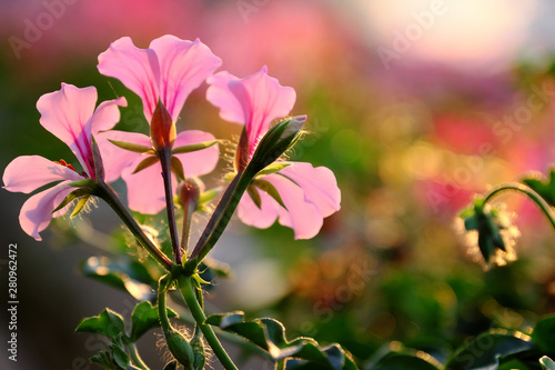 Obraz premium nature background colorful geranium flower blossom vibrant in garden, sunset backlight