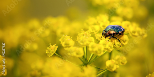 © Reddogs, Naklejka premium Nature banner of a rose chafer insect bug as eating yellow spurge flowers. Pollen, pollination in the garden.