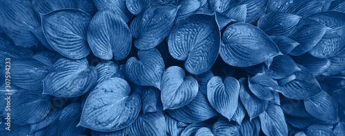 Fototapeta premium Nature concept. Top view. Green leaves texture in monochrome color. Trendy blue and calm color. Tropical leaf background.