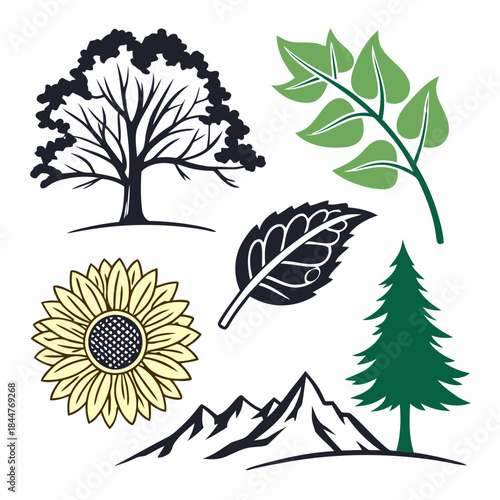 © Jamshadul, Fototapeta premium Nature element icons including trees, leaves, sunflower, and mountain silhouette set