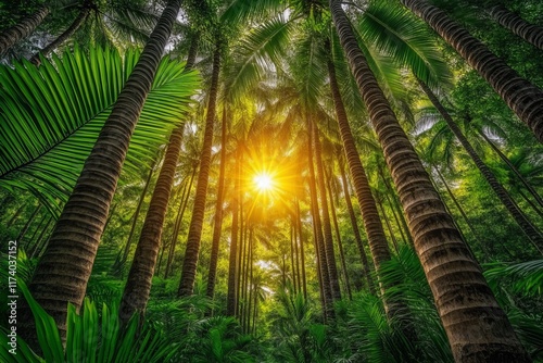 Fototapeta premium Nature, forestry, habitat, environment and sustainability concepts In the spring forest, the setting sun's rays filter through the leaves and branches