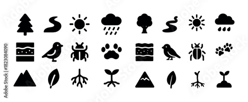 Naklejka premium Nature icons collection: trees, weather, animals, and plants in bold black silhouettes