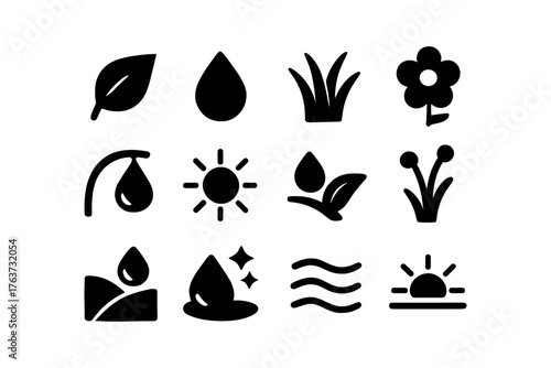 Fototapeta premium Nature icons set: minimalist symbols of plants, water, and sun in black