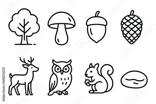 Fototapeta premium Nature icons: tree, mushroom, acorn, pinecone, deer, owl, squirrel, seed