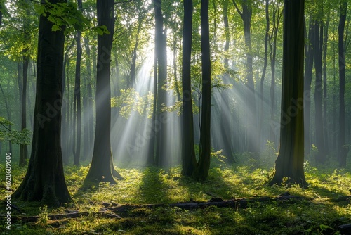 Fototapeta premium Nature is characterized by autumn forest trees, green wood, and warm sunlight backgrounds