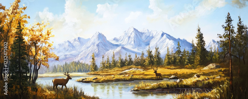 © Printable Wall Art, Naklejka premium Nature landscape painting,mountains,trees,river,deer. vintage style oil on canvas