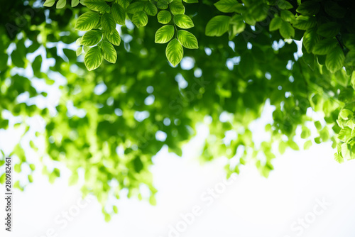 © Fahkamram, Fototapeta premium Nature of green leaf in garden at summer. Natural green leaves plants using as spring background cover page greenery environment ecology wallpaper