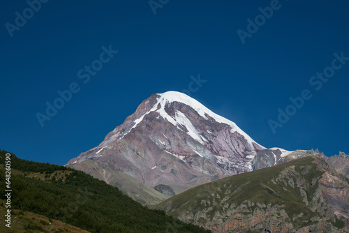 Fototapeta premium Nature of the North Caucasus. The snowy peak of Mount Kazbek. View from the peak in the village of Stepantsminda, Kazbegi. Blue cloudless sky. Trip to Georgia.