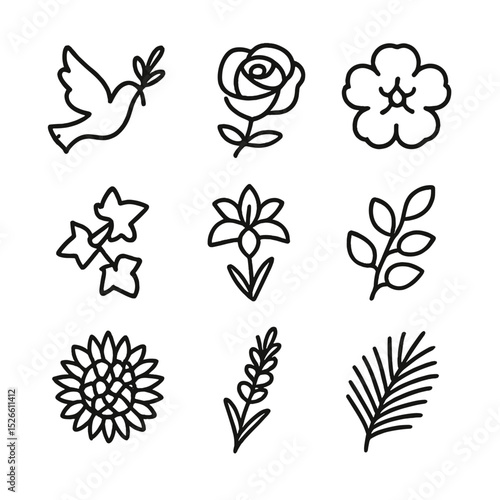 Fototapeta premium Nature Outline Icons. Outline icon set of dove and flora: olive twig, rose bloom, cherry blossom, lily stem, ivy vine, eucalyptus
