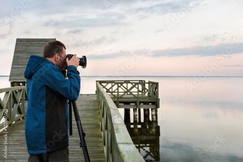 © webstoodio, Obraz premium Nature photographer taking photos of the lake at sunset