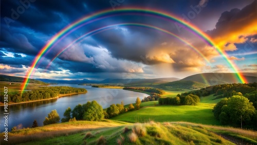 © Panton, Naklejka premium Nature's Arc A Breathtaking Rainbow Over Serene Landscapes
