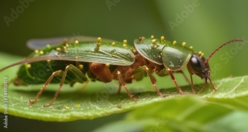 Fototapeta premium Nature's Artistry - A Close-Up of a Green and Brown Leaf Bug