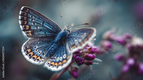 Obraz premium Nature's Blue Butterfly on Purple Bloom Macro
