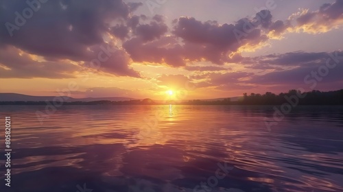 Fototapeta premium Nature's Canvas: A Mesmerizing Sunset Paints the Sky Above the Tranquil Lake