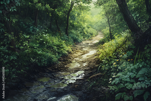 © Hettie, Obraz premium Nature's Challenge: Navigating Muddy Trails in Lush Paradise