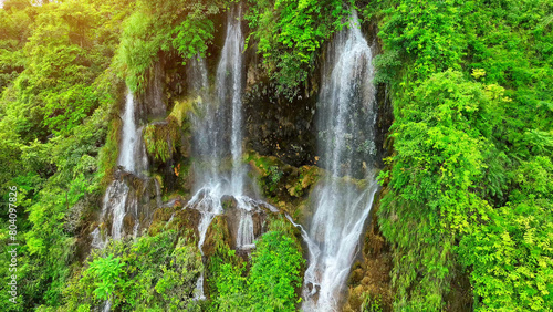 Obraz premium Nature's Hidden Wonder: From above, witness the breathtaking allure of a mystical waterfall concealed amidst the vibrant, green heart of the jungle. Oasis paradise woods. Thailand.