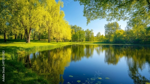 © Togrul, Fototapeta premium Nature's mirror: pond reflects spring park and trees.
